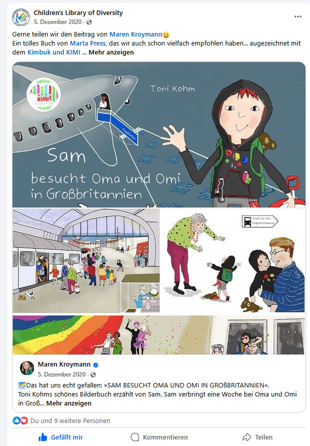 Toni Kohms schönes Bilderbuch erzählt von Sam. Sam verbringt eine Woche bei Oma und Omi in Großbritannien und begleitet das Frauenpaar in seinem Alltag - geht mit Omi auf die Baustelle und mit Oma zum Streetart Festival. Das Leben ist aufregend und vor allem bunt. Es geht es um Vielfalt. Bunt sind die Bilder und bunt die Menschen...👩👩👧Vielleicht haben Sie Lust, Ihre Nachbarskinder, Kinder, Enkel oder einen Kindergarten zu beschenken. Das Buch stammt aus dem independent Buchsektor, erschienen beim feinen, nachhaltigen Verlag Marta Press."